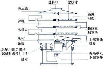 XZS系列旋振篩,由直立式電機(jī)作激振源,電機(jī)上、下兩端安裝有偏心重錘,將電機(jī)的運(yùn)動轉(zhuǎn)變?yōu)樗健⒋怪?、傾斜的三次元運(yùn)動,再把這個運(yùn)動傳遞給篩面。調(diào)節(jié)上、下兩端的相位角,可以改變物料在篩面上的運(yùn)動軌跡。